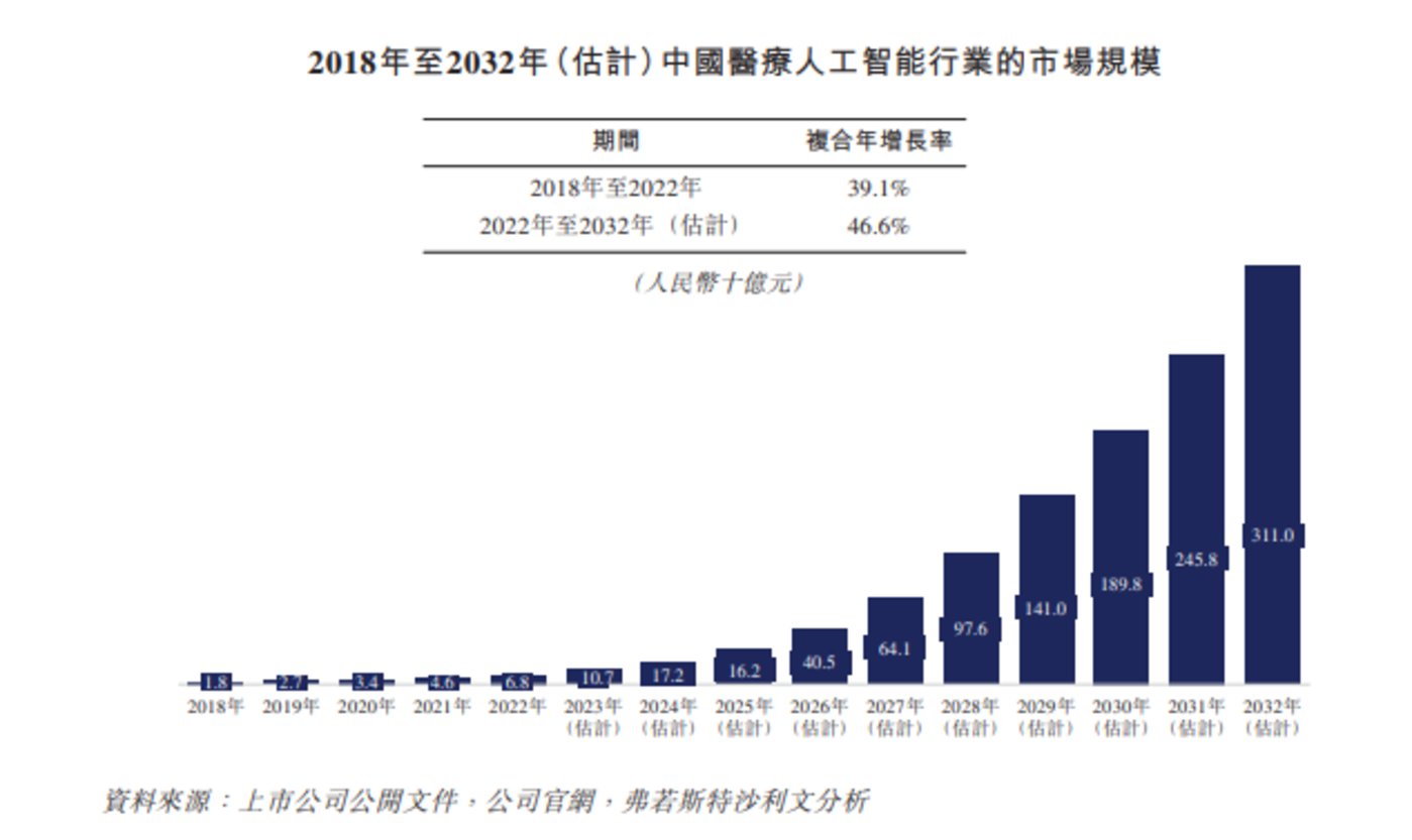 随着我国AI技术日渐成熟,医疗人工智能行业市场规模得以显著增长。弗若斯特沙利文数据显示,从2018年至2022年,我国医疗人工智能行业规模由18亿元增长至68亿元,年复合增长率达到39.1%。预计到2032年,这一行业规模增至3110亿元,2022-2032年年复合增长率高达46.6%。