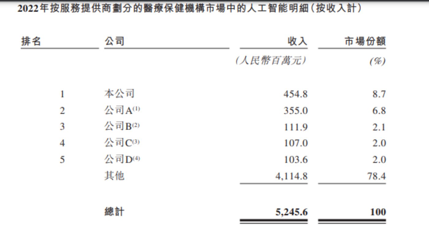 招股书显示,2022年讯飞医疗凭借其收入规模登上中国医疗人工智能行业的榜首。不过,医疗机构人工智能行业呈高度分散的激烈竞争态势,2022年排名前五的市场份额占比合计为21.6%,讯飞医疗市占率仅为8.7%。作为头部企业,讯飞医疗先发优势并不算明显。