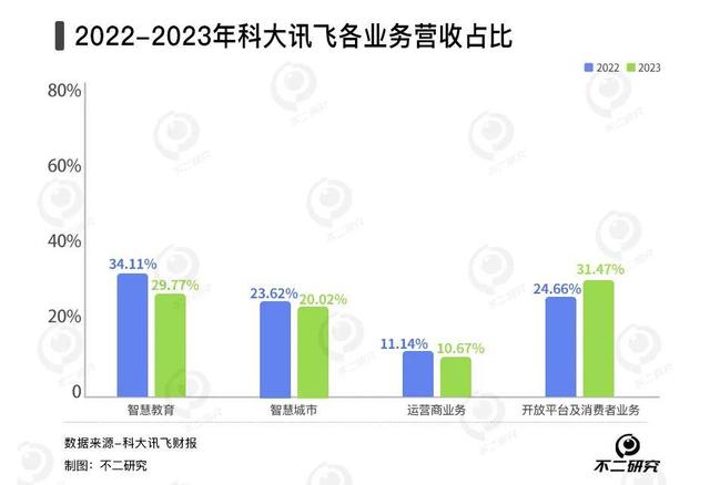 据2023年报,科大讯飞的智慧教育、智慧城市、运营商业务、开放平台及消费者业务,当期营收占比分别为29.77%、20.02%、10.67%、31.47%。