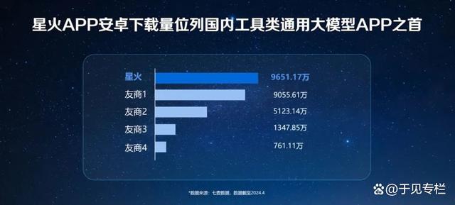 目前,讯飞星火大模型在大模型领域,已经位列头部阵营,用户体验也随之升级。讯飞星火在国内工具类通用大模型APP中的下载量和用户评价均位居前列,据七麦数据显示,讯飞星火App在安卓端的下载量已经超过9600万次,在国内工具类通用大模型App中排名第一。