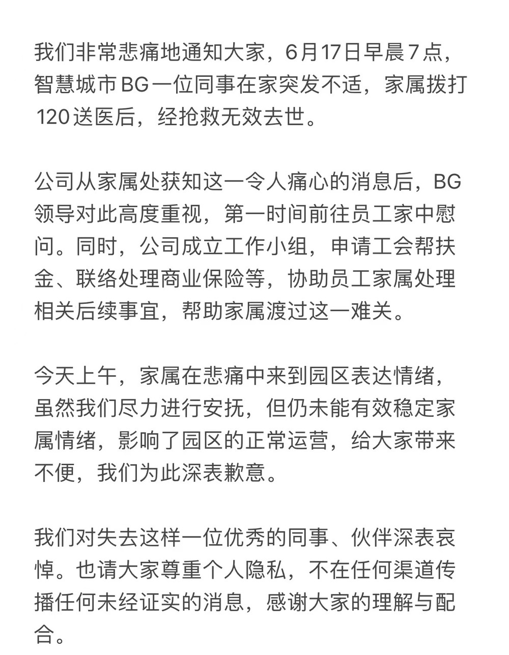 通报内容显示,6月17日早晨7点,科大讯飞智慧城市BG(事业群)一位员工在家突发不适,家属拨打120送医后,经抢救无效去世。