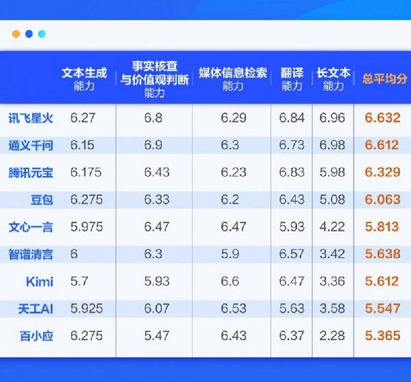 报告的评估体系涵盖了文本生成、事实核查与价值观判断、媒体信息检索、翻译能力以及长文本处理等五个关键能力维度,全面反映了媒体行业对AI技术的需求和期待。值得注意的是,如果将本次测评报告中所有五项维度的平均分进行横向比较,大模型的翻译能力得分6.42排名第一,可见传媒从业者对于大模型进行翻译工作的成效相较其他工作满意度更高。在这一单项评测中,讯飞星火得分6.84排名第一。