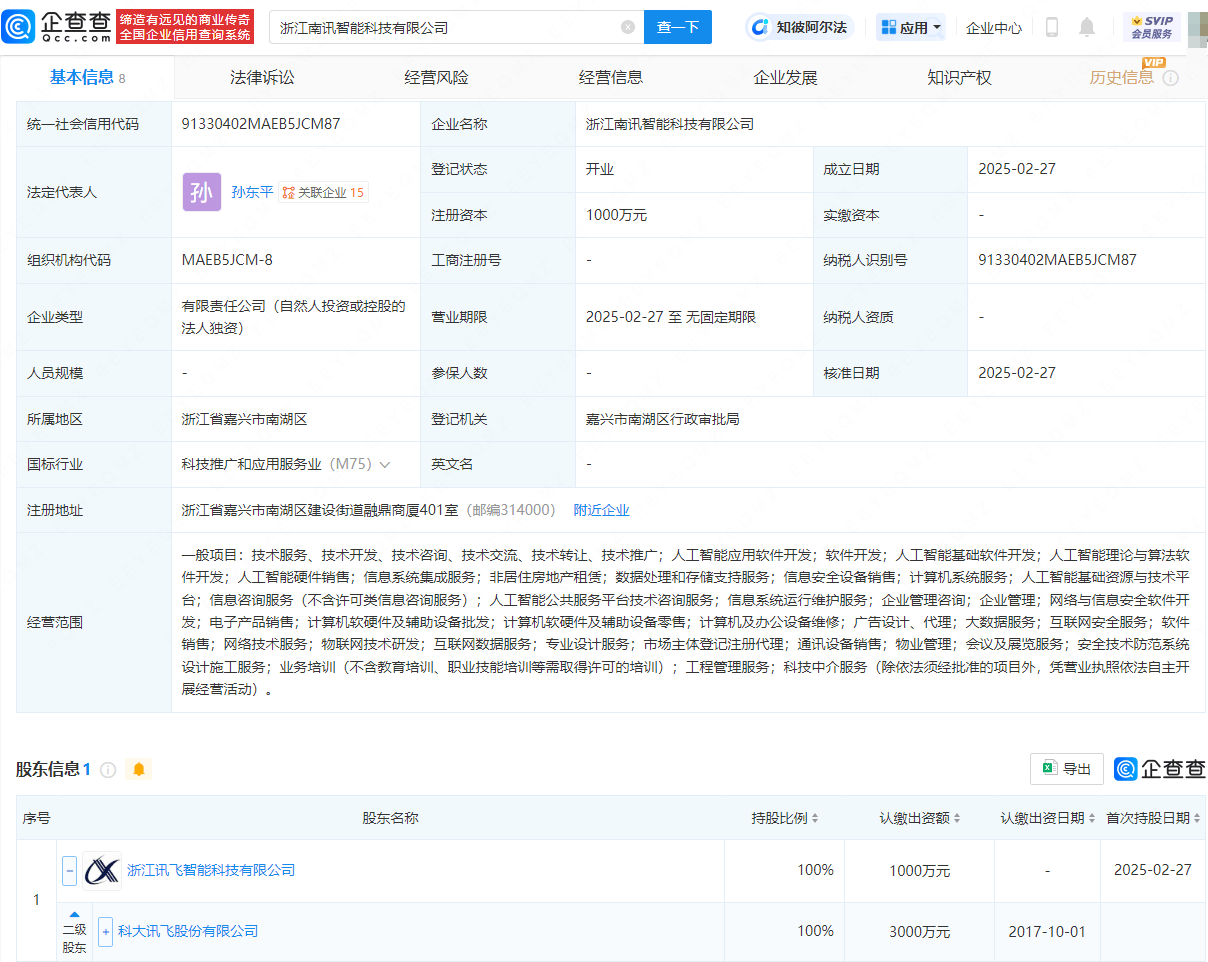 近日,浙江南讯智能科技有限公司成立,法定代表人为孙东平,注册资本为1000万元,经营范围包含:人工智能应用软件开发;人工智能基础软件开发;人工智能理论与算法软件开发;人工智能硬件销售;物联网技术研发等。股权穿透显示,该公司由科大讯飞(002230)间接全资持股。