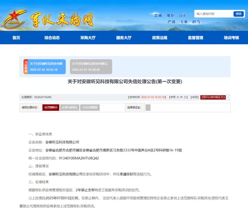 军队采购网2025年7月2日发布的处理公告显示,安徽听见科技有限公司在军队集中采购活动中存在串通投标的违规情形(处理编号:SX2025116266)。根据军队相关法律法规,联勤保障部队后勤部采购管理处对其作出处理:禁止2年内参加全军物资工程服务采购活动;在禁止期内,法定代表人胡国平控股或管理的其他企业禁止参加上述范围军队采购活动,授权代表王甍禁止代理其他供应商参加上述范围军队采购活动。
