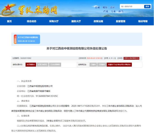 江西省中核测绘院有限公司因违规行为被纳入军队采购失信名单,面临3年禁入处罚。