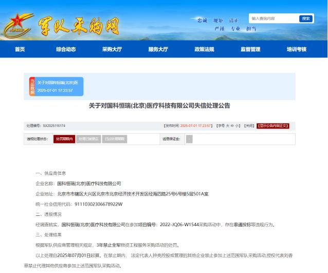 国科恒瑞(北京)医疗科技有限公司因串通投标遭监管重罚。
