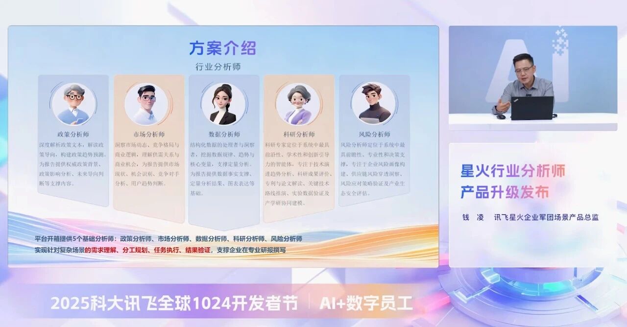 人工智能正经历深层次角色转变,从执行命令与生成内容的AI工具,成长为能理解场景、参与决策并协同创新的“数字队友”。10月27日,2025科大讯飞全球1024开发者节正式发布“AI+数字员工”系列产品——“评标智能体”与“星火行业分析师”。前者在项目评审中实现智能评估与辅助决策,后者则通过多模态洞察与专业研报生成,助力企业精准研判行业风向、驱动高效决策。