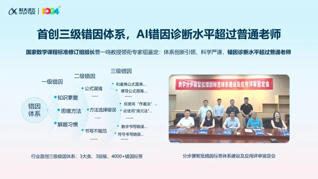 首先就是教育领域。科大讯飞首创了三级错因体系——从一级错因是知识掌握、思维方法、解题习惯,二级错因有公式混淆、方法选择错误、书写不规范等错误,再到三级具体知识点错因,整体呈现出三大类三层级4000多个错因标签。