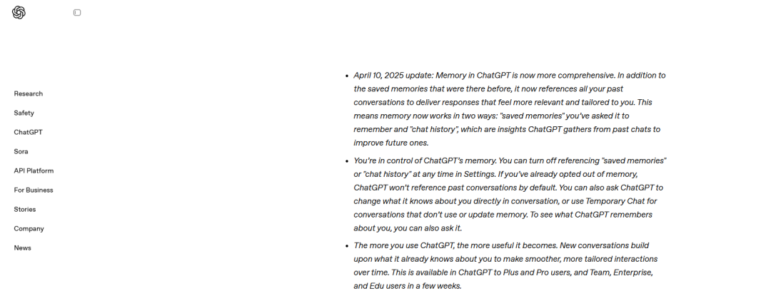 OpenAI更新ChatGPT记忆功能的页面,图片来源:OpenAI