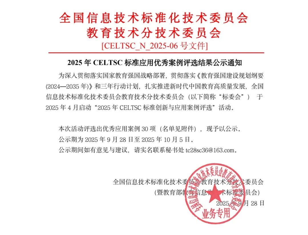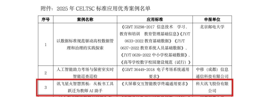同时,科大讯飞围绕《教师数字素养》和《大屏幕交互智能教学终端通用要求》两项教育行业标准,积极推动标准的实践应用与推广工作。凭借在教育信息化标准落地及创新实践方面的突出成效,科大讯飞相关案例获得CELTSC的高度认可: