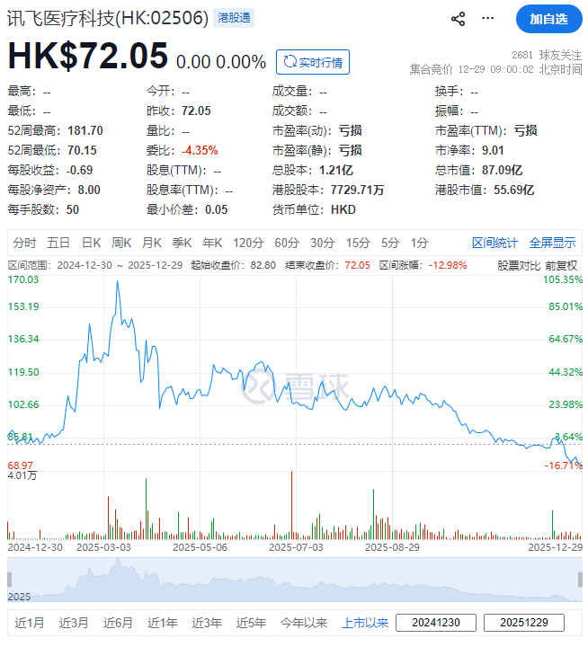 讯飞医疗科技,于2024年12月30日港交所上市,当时每股82.80港元发行703.55万股H股,募资5.83亿港元。截至2025年12月29日收市,每股报72.05港元,总市值约55.69亿港元。