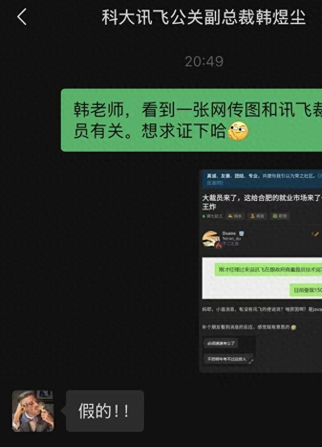 3月17日消息,日前,有一张关于科大讯飞将对技术岗进行大幅裁员的截图流传,对此,网易《态度》栏目向科大讯飞公关副总裁韩煜尘进行求证,韩煜尘独家回应我们称:假的!