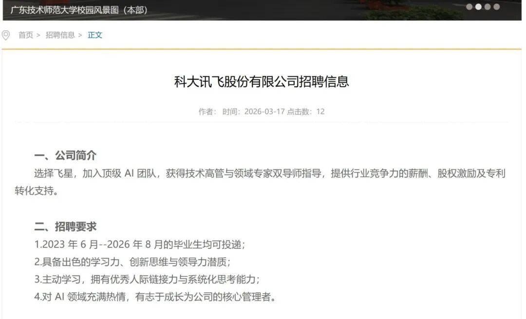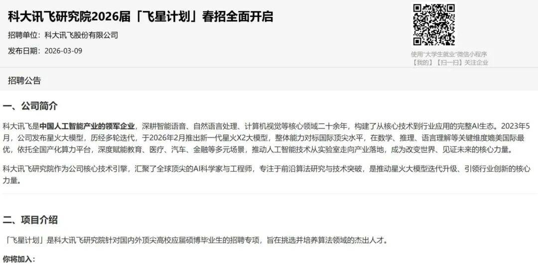 2026年3月初,科大讯飞高调启动了研究院「飞星计划」和「飞凡计划」的春季补录。招聘简章中明确写道,面向2026届顶尖技术类硕博毕业生,招聘AI研究算法工程师(涵盖语音大模型、认知大模型、多模态大模型等前沿方向),并承诺“行业顶尖薪资待遇”、“优先进入青年科学家及技术管理后备池”。