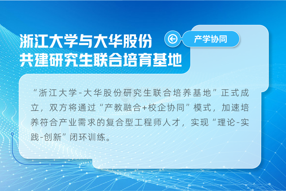 近年来,大华股份以国家级企业技术中心、技术创新示范企业、工业设计中心及省级重点实验室等科研平台为支撑,与浙江大学、西安电子科技大学、杭州电子科技大学等多所高校和科研院所建立了长期的产学研合作关系,通过深度产教融合,推动科技创新、人才培养和产业升级的协同发展。