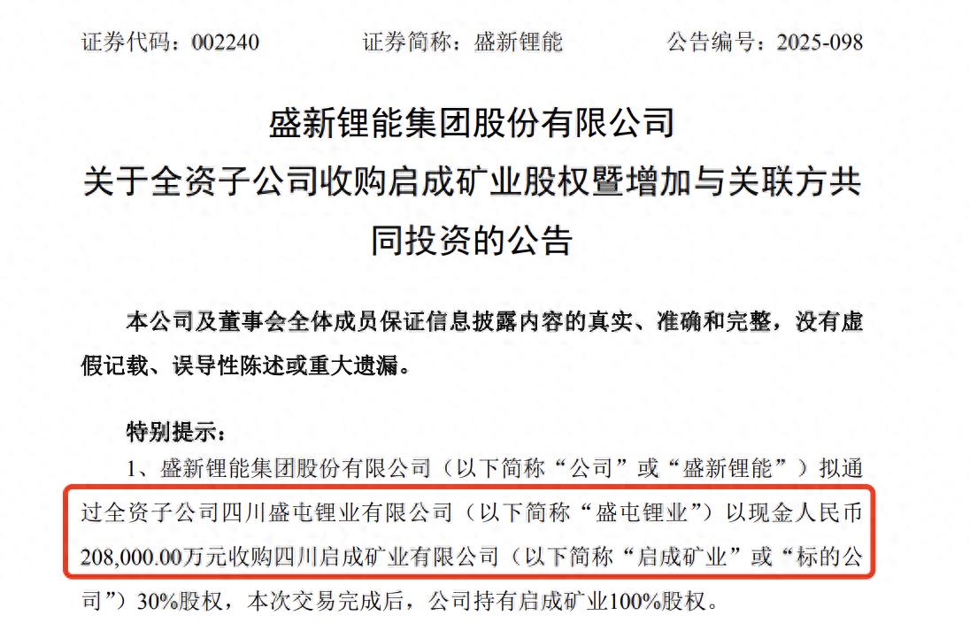 2025年12月30日,盛新锂能发布公告称,公司拟通过全资子公司四川盛屯锂业有限公司以现金20.8亿元收购四川启成矿业有限公司30%股权。据媒体报道,这已经是盛新锂能年内对启成矿业的二次出手,上一次并购发生在2025年9月,其以14.56亿元拿下后者21%股权,叠加此次交易,盛新锂能累计耗资超过了35亿元。而其之所以频繁出手,核心是为了获得启成矿业旗下的四川省雅江县木绒锂矿。