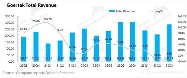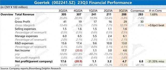 歌尔股份 2023 年第三季度总营收 288 亿元,同比下滑 5.8%,略超市场预期(283 亿)。收入跌幅,有所收窄。虽然本季度公司的智能硬件仍有增长,但在智能声学整机业务下滑的影响下,最终出现下滑。