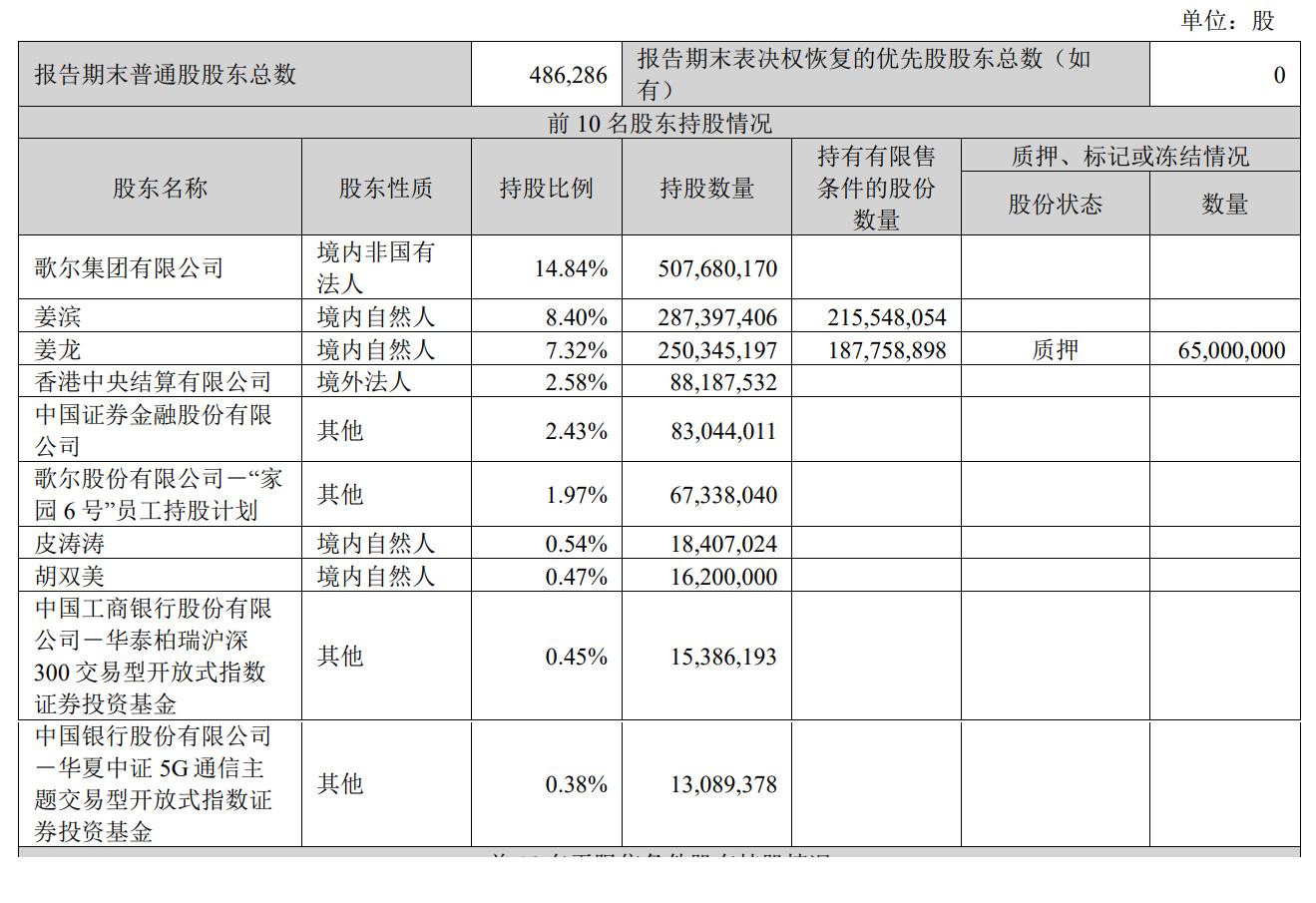 截至2023年9月30日,歌尔集团有限公司持股14.84%,姜滨持股8.4%,姜龙持股为7.32%,中国证券金融股份有限公司持股2.43%,香港中央结算有限公司持股为2.58%,中国证券金融股份有限公司持股为2.43%,歌尔股份有限公司-“家园 6 号”员工持股计划持股为1.97%;
