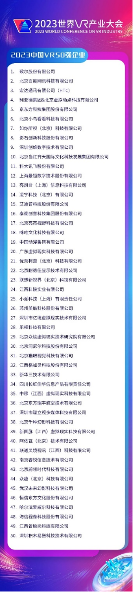 在今年10月的2023世界VR产业大会上,“2023中国VR50强企业”名单发布,歌尔股份荣登名单榜首。