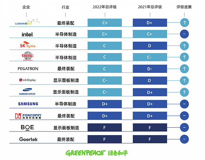 11月21日,绿色和平东亚分部发布《“外包”的排放——全球头部消费电子供应商气候行动媒体简报(2023)》,对全球消费电子行业11家头部供应商的气候行动进行了综合评估。其中,三星电子、富士康、京东方(000725.SZ)、歌尔股份(002241.SZ)的表现不及格(D+或F)。