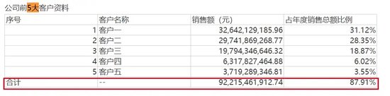 2023年,来自前五大客户的销售额达到874.81亿元,占年度销售总额比例高达88.75%,较2022年的87.91%比例更进一步。