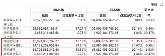 其实,歌尔股份2023年业绩的下滑,并非单项业务之过,而是精密零组件、智能声学整机、智能硬件等三大主力业务全方面的下滑,分别同比下滑7.23%、6.55%、6.93%。
