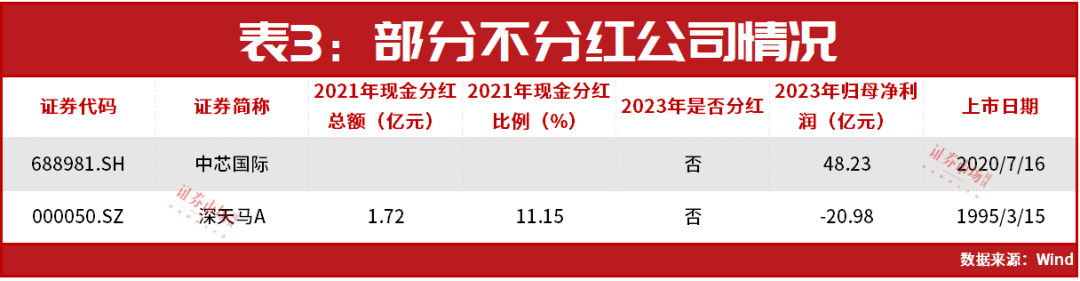 若盈利为负,上市公司分配利润的“门槛”会变得更高。在2023年度拟不做利润分配的公司中,深天马A年度归母净利润亏损近21亿元,公司在原因说明中指出,一是公司所处的显示面板行业属于资金密集型与技术密集型行业,需要持续投入;二是公司2023年度未达到《公司章程》中关于现金分红条件的第一条、第二条和第五条之规定,即公司年末合并未分配利润为负,且母公司可供分配每股利润为0.12元,低于《章程》规定的0.2元;2023年每股收益为-0.8535元,低于《章程》规定的0.1元;公司未来十二个月内预计对外投资和购买设备的现金支出超过公司最近一期经审计净资产的10%。公司留存未分配利润累积结转至下一年度,将用于满足公司日常经营发展、项目建设、投资及流动资金需要等,保障公司正常生产经营和稳定发展,增强抵御风险的能力,进一步提升公司核心竞争力(见表3)。