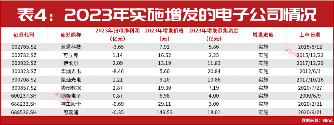 除了分红和回购,还值得一提的是,年内有部分电子公司在定增资金的使用方面出现了新变化。据统计,2023年共有18家电子公司存在增发事项,其中有9家公司完成实施(见表4)。