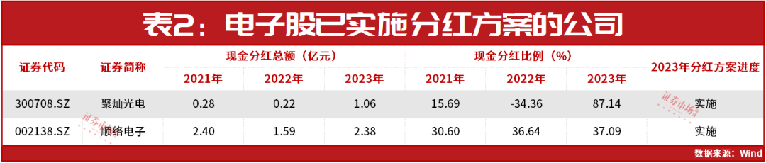 在106只电子股中,2023年报提出分红的公司达82家,不分红或未提分红与否的公司有24家。截至目前,已有两家公司实施了2023年度分红计划,分别是聚灿光电和顺络电子(见表2)。