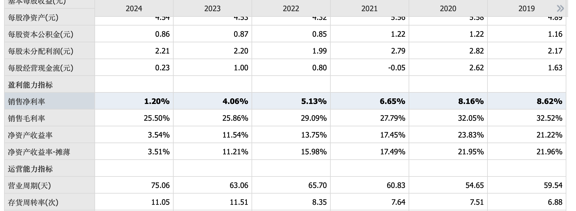 实际上,九阳股份的销售净利率已经由2016年的10.03%降至2024年的1.20%,连续第8年下滑。截至2024年,公司的销售净利率指标在同业中处于落后位置。