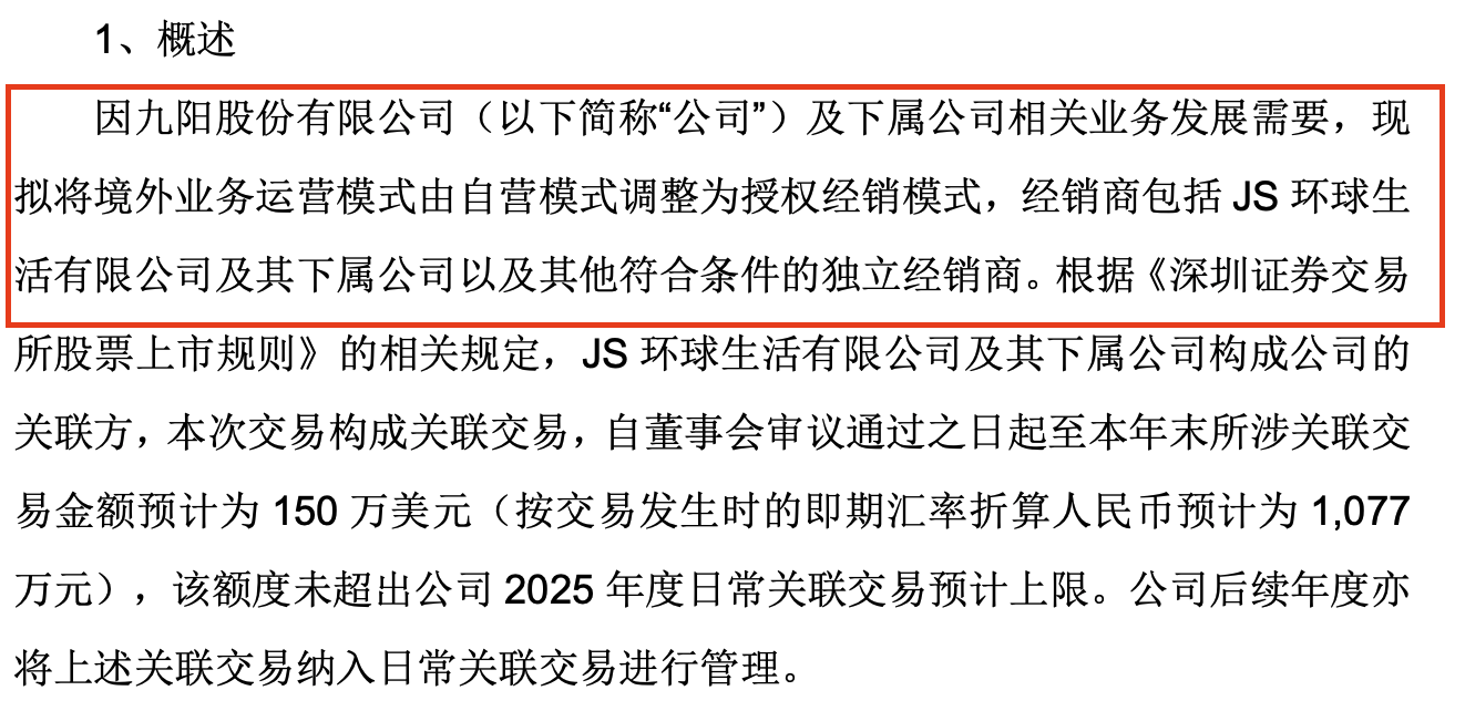 第三季度报告发布的同时,公司还发布了境外业务运营模式的调整公告,公告称因九阳股份及下属公司相关业务发展需要,现拟将境外业务运营模式由自营模式调整为授权经销模式,经销商包括 JS 环球生活有限公司及其下属公司以及其他符合条件的独立经销商。
