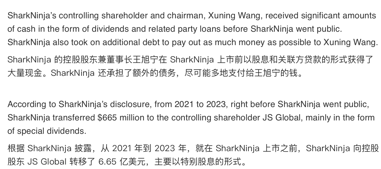 做空机构指出,王旭宁的做法,极大了损害了美股公众股东的利益。而在SharkNinja上市后,王旭宁更是将公司当成了“提款机”,通过宣派巨额股息、抛售股票的方式,累计套现逾9亿美元。