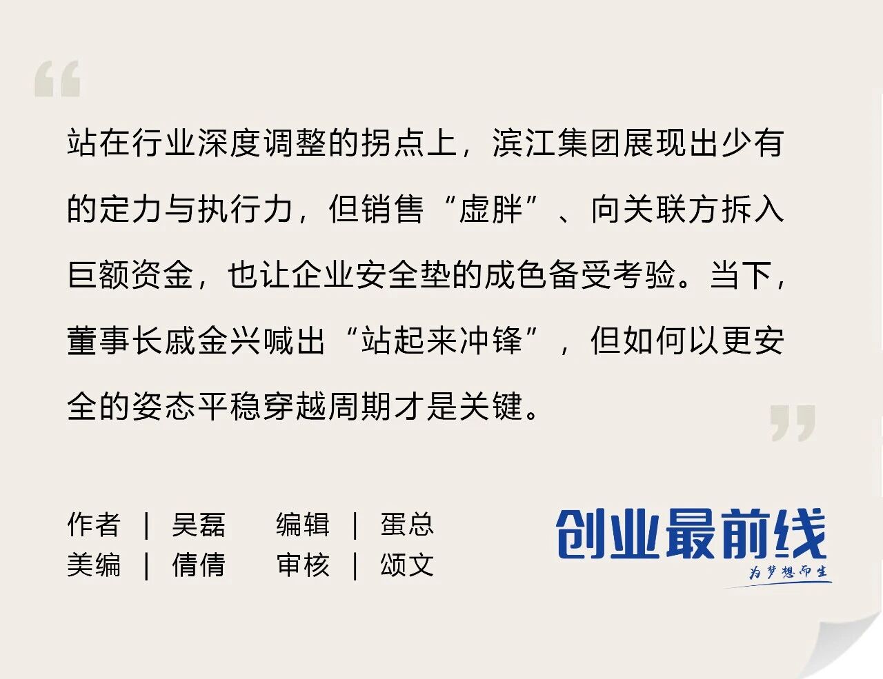 只不过,在楼市下行时期没有房企能够独善其身。近日,戚金兴公开声称,这有可能是(滨江集团)“现阶段最后一个千亿”。