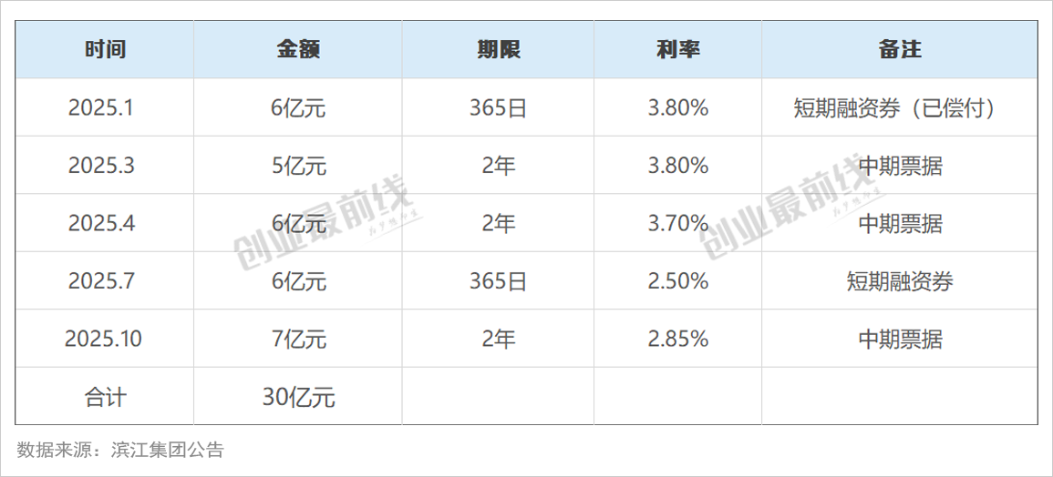 据「创业最前线」不完全统计,滨江集团2025年至少发行了5笔债券,融资30亿元,这些资金全部用于归还、置换过往发行债券的本息。于2025年三季度末,滨江集团的长期借款高达235亿元。