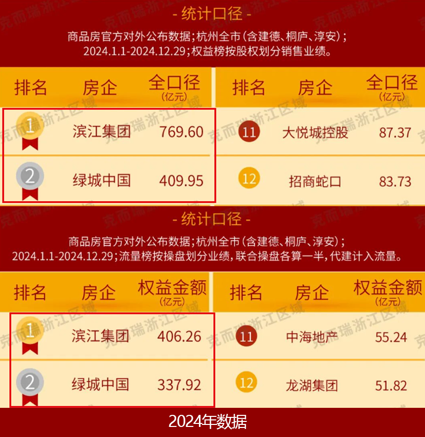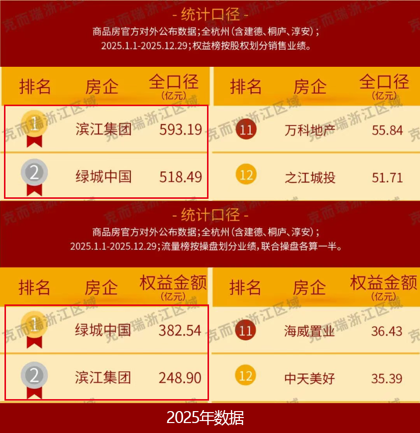 如今,这种竞争正在逐渐白热化。据克而瑞数据,2025年,滨江集团在杭州实现全口径销售额593.19亿元,力压绿城的518.49亿元。