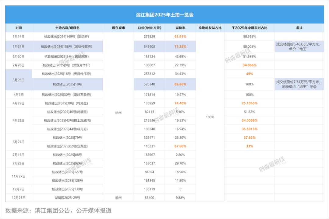 2025年,滨江集团拿地势头汹涌。据「创业最前线」不完全统计,滨江集团全年在土拍市场竞得19宗土地,其中18宗位于杭州市、1宗位于浙江省湖州市,对杭州的重视不言而喻。