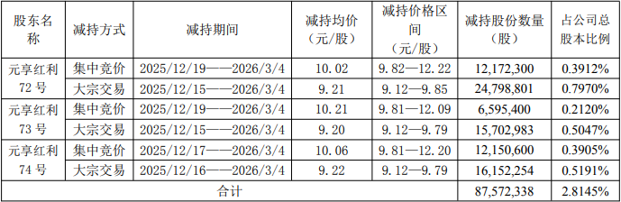 2025年12月19日至2026年3月4日,元享红利72号通过集中竞价方式减持12,172,300股,减持均价为10.02元/股;2025年12月15日至2026年3月4日,元享红利72号通过大宗交易方式减持24,798,801股,减持均价为9.21元/股。