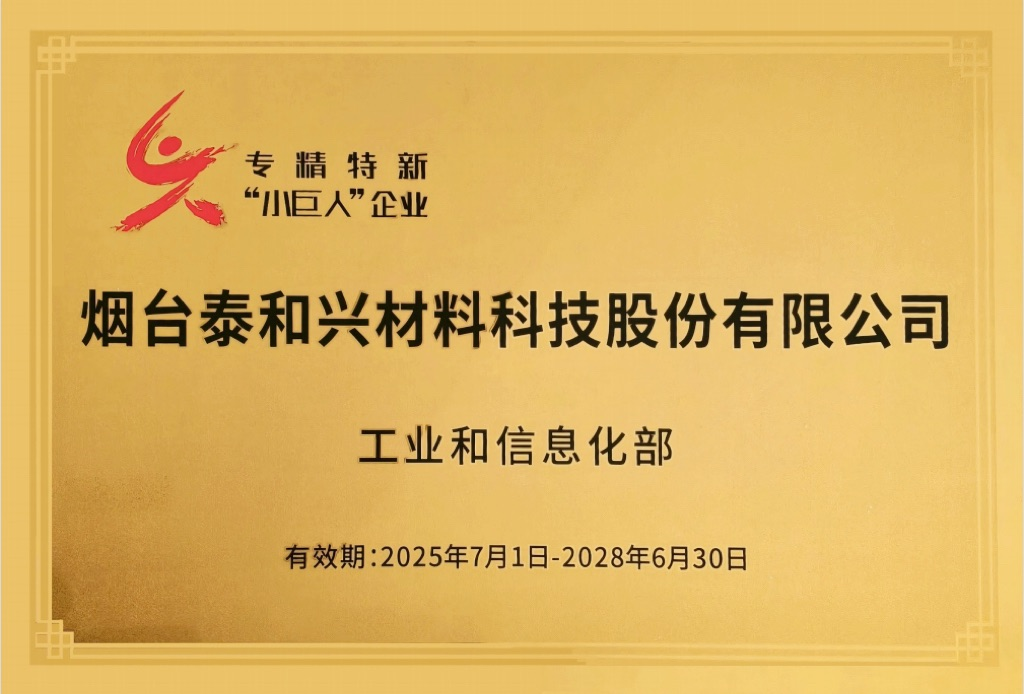 近日,泰和新材旗下子公司烟台泰和兴材料科技股份有限公司(以下简称“泰和兴”)凭借在核心技术研发、细分市场深耕、专业化运营能力等方面的卓越表现,成功荣获国家级专精特新“小巨人”企业称号。这一国家级荣誉,不仅是对中小企业创新能力、市场竞争力和发展潜力的最高认可,更是对泰和兴多年来坚守实业、聚焦主业、深耕细分领域所取得成绩的充分肯定。