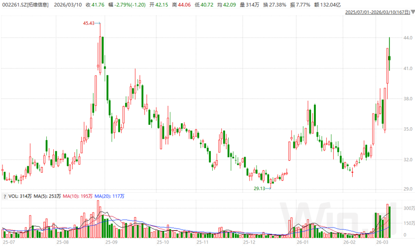 3月6日、9日,拓维信息股价连续两日放量涨停。3月10日,拓维信息盘中继续冲高至44.06元/股,刷新去年8月以来的高点,但此后回落,截至收盘跌2.79%,报41.76元/股,总市值约526亿元。