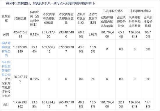 1月24日消息,浙富控股公告称,公司近日接到控股股东孙毅先生及其控制的企业桐庐源桐实业有限公司的通知,获悉其所持有的公司部分股份办理了质押及解质押登记手续。本次孙毅质押股份数量为1.02亿股,桐庐源桐解除质押股份数量为9752.72万股。截至本公告披露日,控股股东及其一致行动人累计质押股份数量为8.65亿股,整体质押比例上升至49.28%。需要指出的是,控股股东孙毅又进一步加大质押,质押比例上升至69.20%,质押用途主要为资金需求。