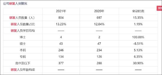 公司骤升的研发费用又是否存在异常。以公司研发费用骤升的2021年为例,公司的研发人员804人,较上一年增幅超15%。值得注意的是,公司如此大的研发人员中,专科及高中以下人员占比超六成。与此同时,公司大幅攀升的研发人员中,高中及以下学历的研发员工数量增加最多,对应增幅高达30%以上。