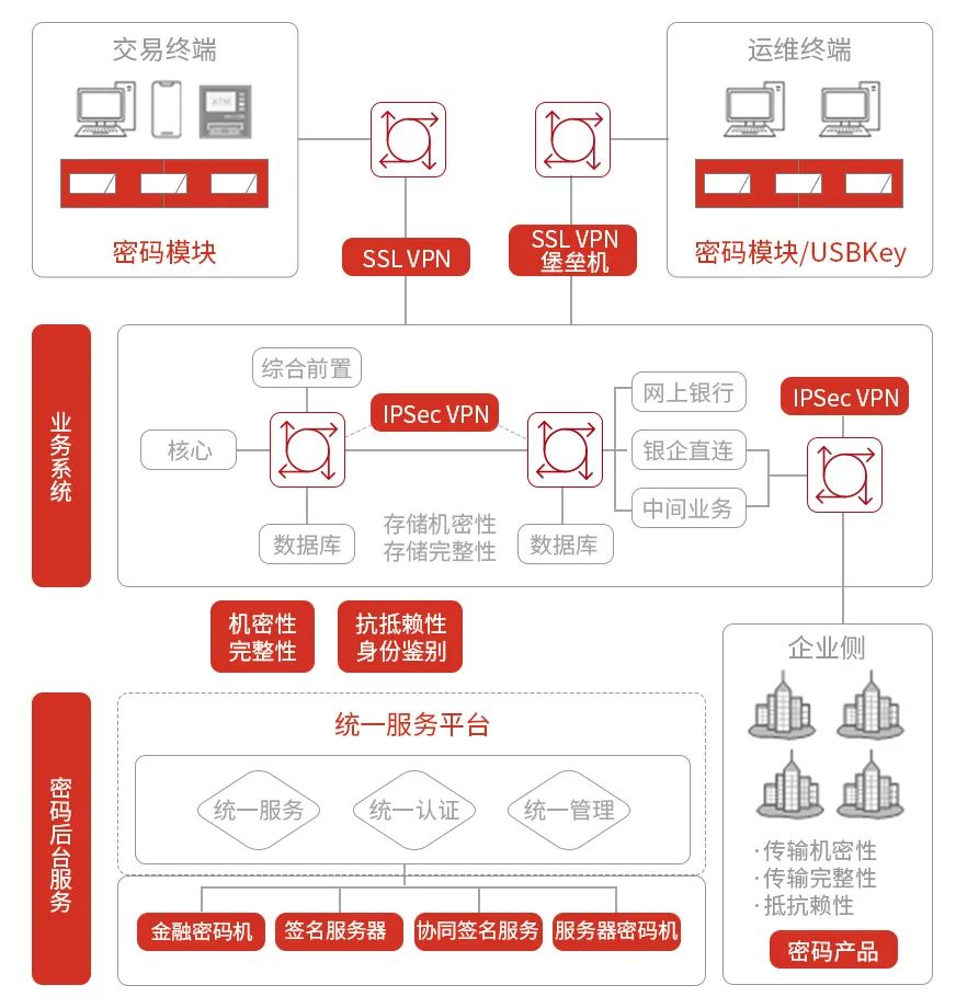 电科网安针对金融银行系统在终端采集、网络传输、过程计算、落地存储等环节中存在的密码应用不全面、密码应用合规性和安全性存短板等风险,推出了1+3+N的密码安全体系模式,构建以密码为核心的1个安全体系,覆盖终端、网络、应用3个层面,并辐射N个业务场景的密码技术应用,可以有效解决核心系统、综合前置、中间业务、网银、银企直连这五大类业务中,交易终端与业务应用之间、运维终端与业务应用之间、系统与系统之间的抗抵赖、身份鉴别、机密性、完整性的密码应用需求。