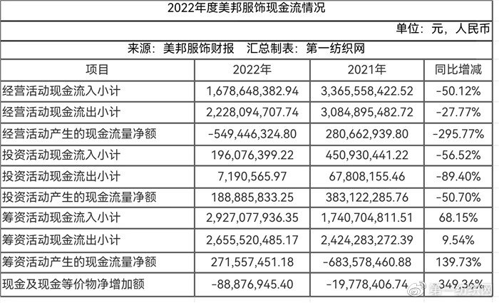 财报显示,报告期内,美邦服饰经营活动产生的现金净流量-5.35亿元,与本年度净利润-8.22亿元存在差异2.87亿元,主要由于资产类(包括使用权资产)折旧1.06亿元,计提资产减值准备和信用减值损失4.55亿元,投资损失0.57亿元,处置资产收益0.20亿元,财务费用支出0.84亿元,其他摊销费用等0.36亿元,存货减少2.74亿元,经营性应收减少1.21亿元和经营性应付减少8.27亿元,最终导致经营活动产生的现金净流量与本年度净利润存在较大差异。