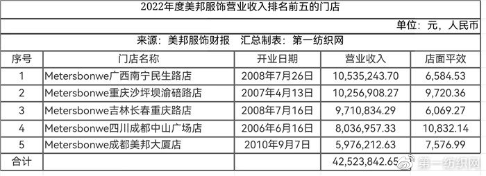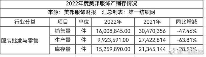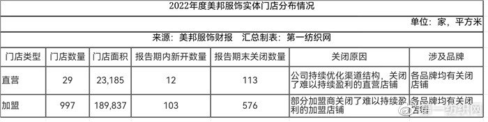 据财报了解到,截止2022年年末,美邦服饰直营店铺存量29家,营业面积总计23185平方米,平均单店营业面积为799平方米,2022年度实现平均单店营业收入649.95万元,平均年化坪效为8129.58元/平方米/年;报告期内,美邦服饰净关闭了574家门店,其中,直营门店仅剩下29家,29家中的12间为新开店铺,全年净关闭101家;批发渠道门店数997家,全年净关闭473家。