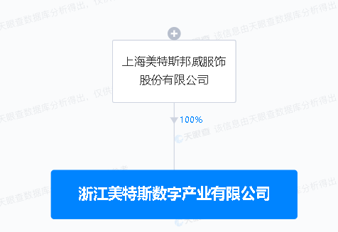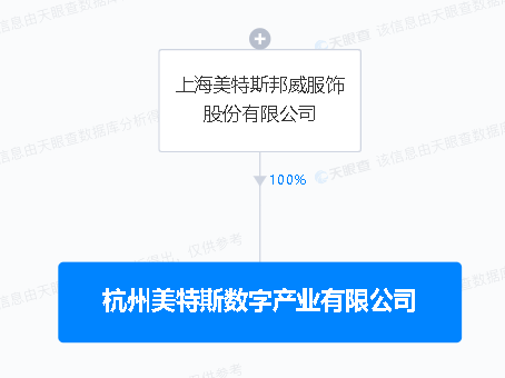 近日,杭州美特斯数字产业有限公司、浙江美特斯数字产业有限公司先后成立,法定代表人均为周成建,注册资本均为1000万元,经营范围含互联网销售、组织体育表演活动、演出经纪等,其中浙江美特斯数字产业有限公司经营范围还包括互联网直播技术服务。股权穿透显示,两公司均由美邦服饰100%控股。