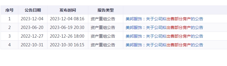 2022年12月26日晚,美邦服饰又披露拟出售部分房产的公告,为盘活公司资产,综合交易条件等因素后,拟以现金交易方式向宁波雅戈尔服饰有限公司出售公司所持有的位于贵州省贵阳市中华中路145号店铺,经双方协商最终确定交易价格为13000万元。