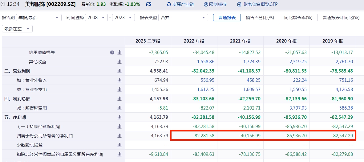 具体来看,美邦服饰2019年归属于母公司所有者的净利润亏损8.25亿元、2020年亏损8.59亿元、2021年亏损4.02亿元、2022年亏损8.23亿元。