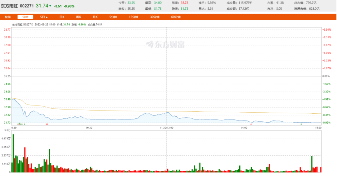 8月23日早盘,东方雨虹股价大幅下跌,一度逼近跌停,股价创年内新低31.74元/股。截至今日收盘,东方雨虹报31.74元/股,跌幅为9.96%。根据最新收盘价计算,东方雨虹市值跌破800亿元,仅为799.7亿元。