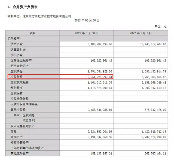截至2022年6月,东方雨虹应收账款达129.54亿元,环比大幅增加。