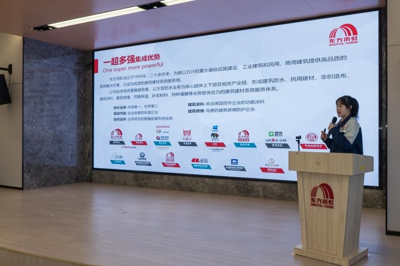 座谈会上,东方雨虹花都工厂专业讲解老师就东方雨虹发展历程、品牌优势、品质经营成果及东方雨虹花都工厂概况进行了详细的介绍。