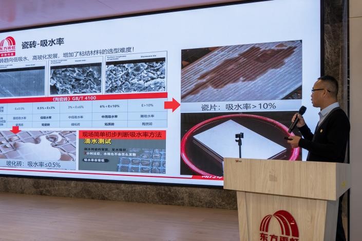 东方雨虹砂粉科技集团广州区域技术总工陈典先生发表《雨虹瓷砖胶产品体系介绍》的主题发言。陈工表示,东方雨虹砂粉科技集团致力于瓷砖铺贴等系统化解决方案,始终坚守高标准产品品质。面对市场竞争形势的变化,雨虹砂粉将持续推出瓷砖胶新品以满足市场需求。